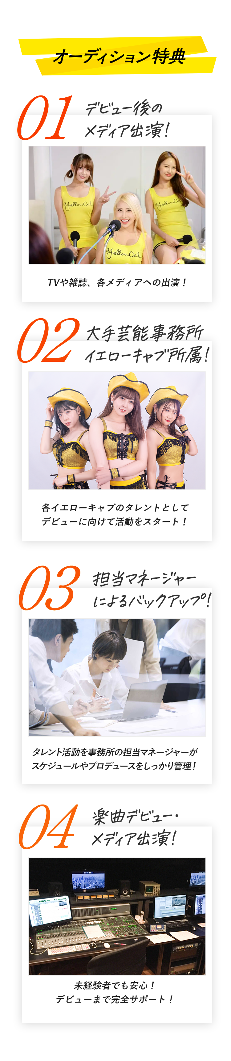 オーディション へ合格された方は合格となった各イエローキャブの事務所にて面談を実施し、問題が無ければその方のの適性に合わせたジャンル(アイドル・女優、モデル、グラビアなど)において活動するために専属契約を締結致します。